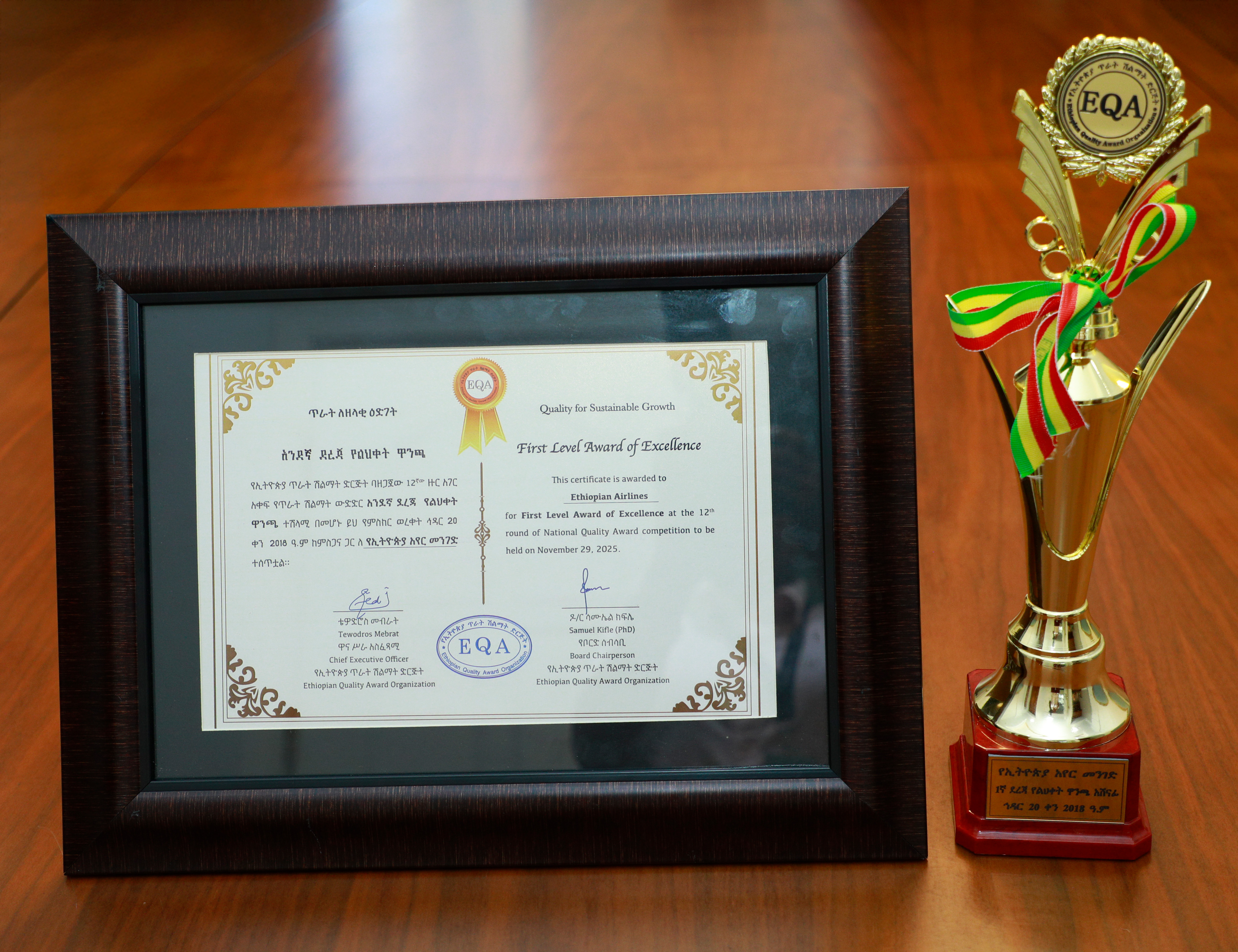 Ethiopian Airlines Group, the largest airline in Africa and one of the fastest growing airline brands globally, is proud to announce that it has won the prestigious First Level Award of Excellence at the 12th National Quality Award Competition Ceremony organized by the Ethiopian Quality Award Organization. Ethiopian Airlines Group CEO Mr. Mesfin Tasew received the award from the Guest of Honor, His Excellency Taye Atske Selassie, President of the Federal Democratic Republic of Ethiopia.