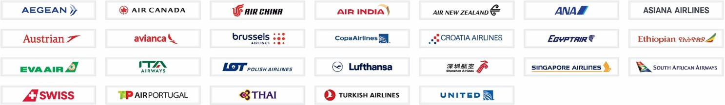The member airlines are: Aegean Airlines, Air Canada, Air China, Air India, Air New Zealand, ANA, Asiana Airlines, Austrian Airlines, avianca, Brussels Airlines, Copa Airlines, Croatia Airlines, EGYPTAIR, Ethiopian Airlines, EVA Air, ITA Airways, LOT Polish Airlines, Lufthansa, Shenzhen Airlines, Singapore Airlines, South African Airways, SWISS, TAP Air Portugal, THAI, Turkish Airlines, United.